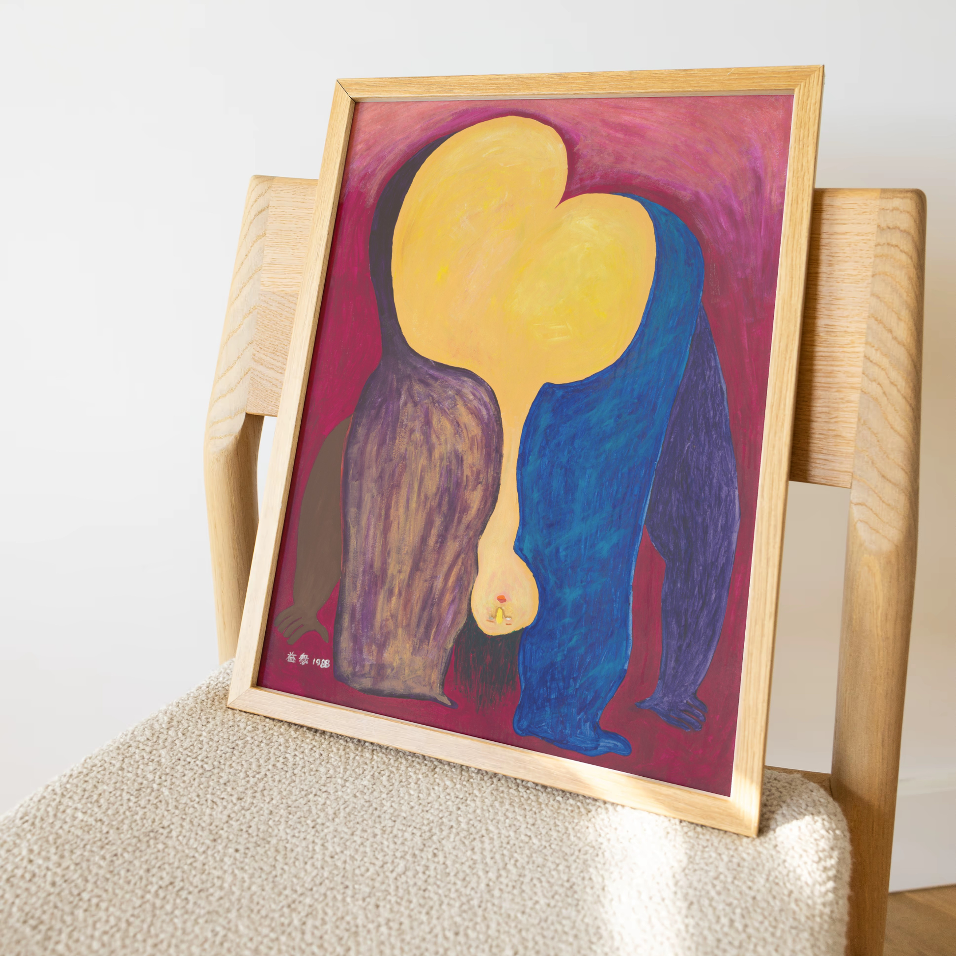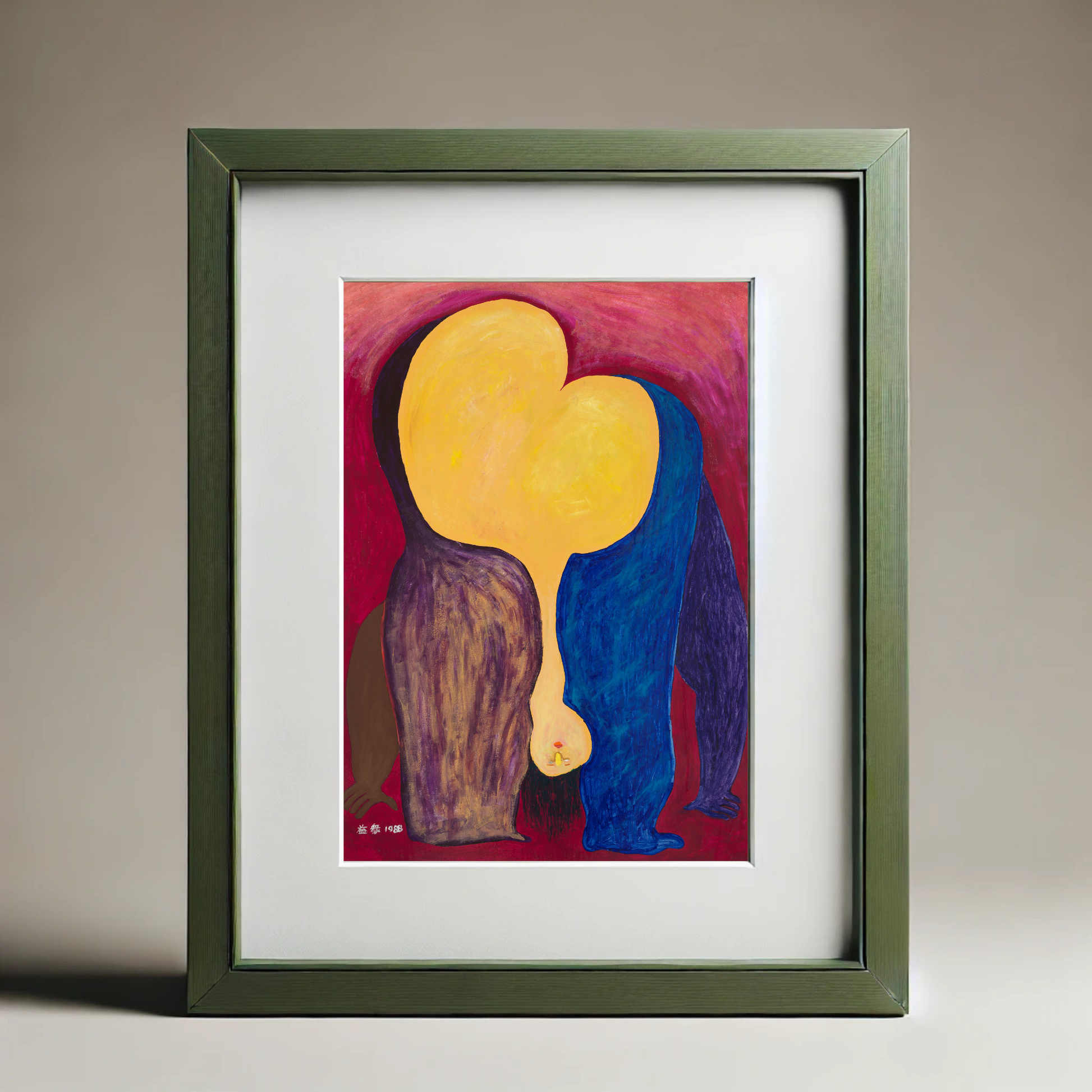 Comprando este print tendrás una reproducción de una pintura expresionista que explora el cuerpo humano desde una perspectiva poco convencional y cargada de simbolismo. La obra representa una figura invertida, con el torso y las extremidades plegados hacia abajo, mientras una cabeza desproporcionadamente grande y luminosa, en tonos amarillos suaves, ocupa el centro visual de la composición.