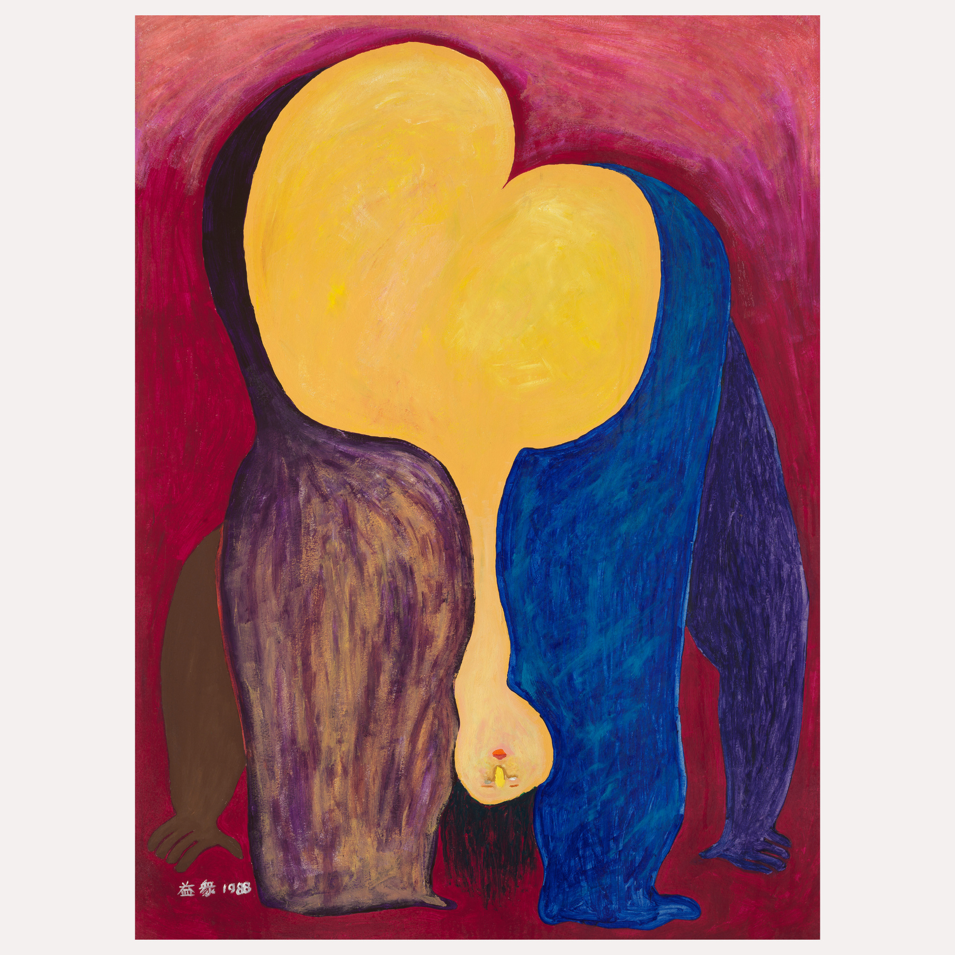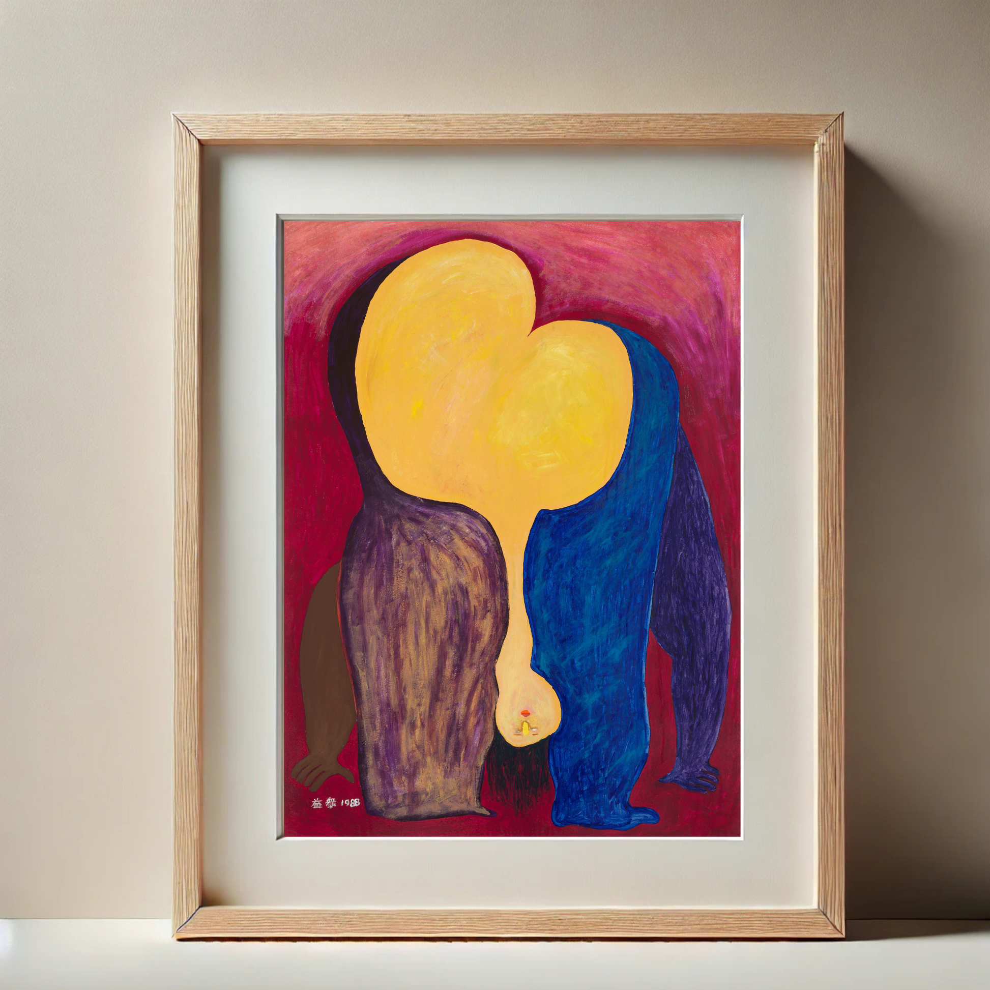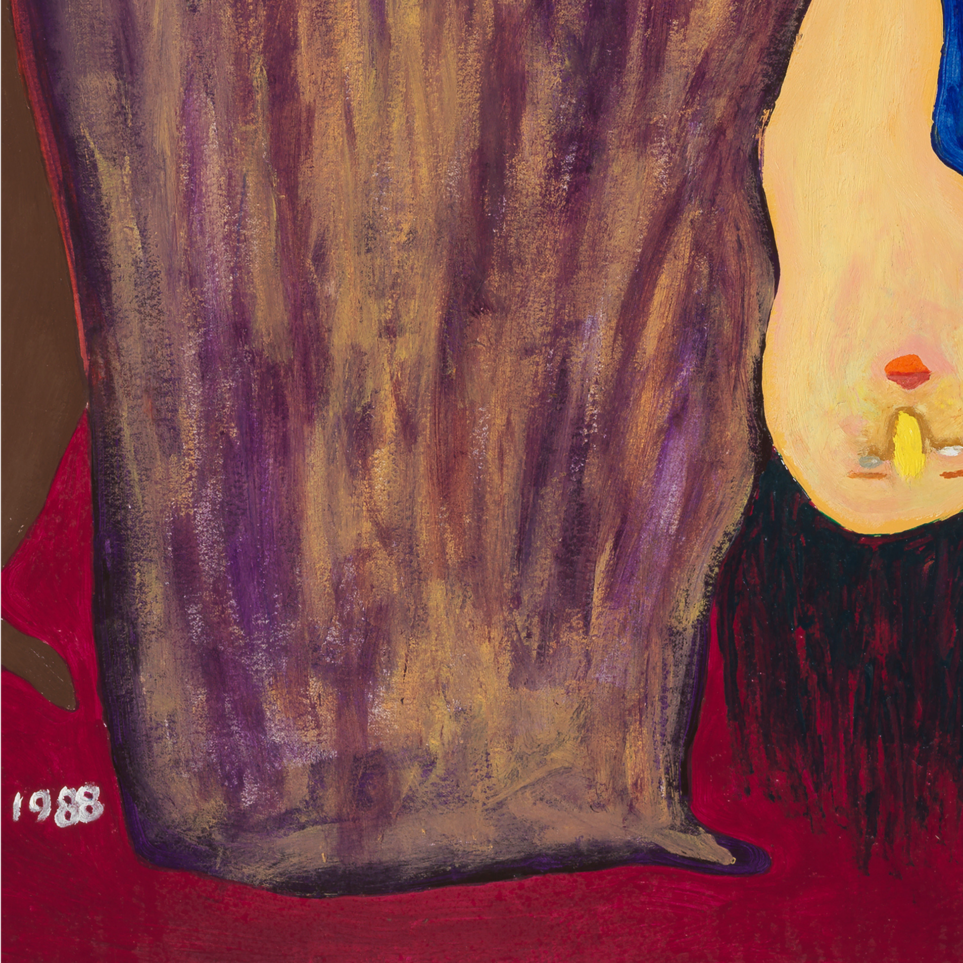 El fondo de la pintura, en un rojo intenso con matices rosados, acentúa el dramatismo y la fuerza emocional de la escena, aportando profundidad y tensión visual. El contraste entre el uso expresivo del color y las formas libres y distorsionadas confiere a la obra un carácter provocador, introspectivo y altamente contemporáneo.