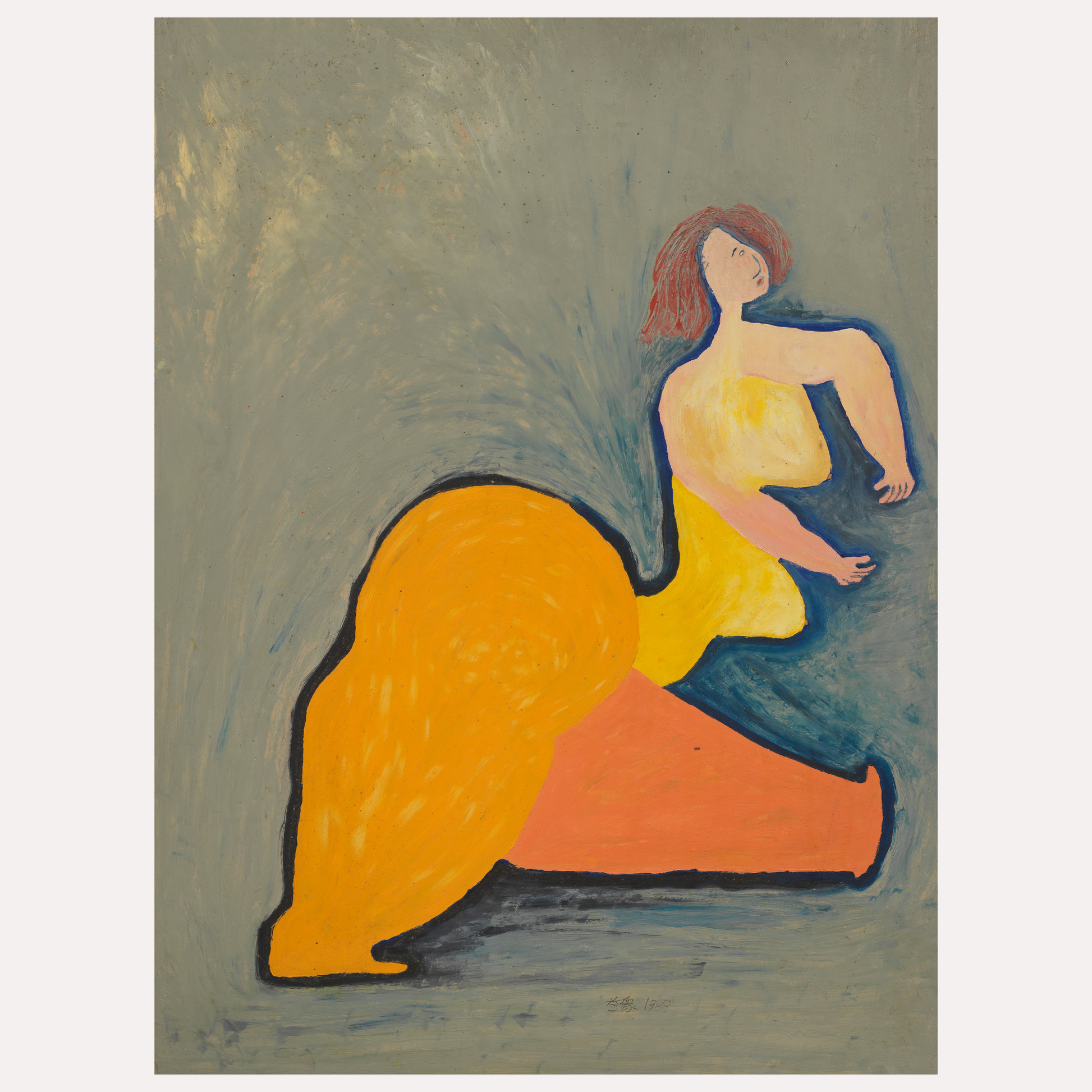 La silueta, delineada con trazos oscuros y decididos, se compone de una gran forma orgánica en tonos anaranjados que representa la parte inferior del cuerpo, contrastando con la torsión del torso, pintado en rosa pálido y amarillo. El cabello, en tonos marrones, cae hacia un lado mientras la figura parece girar o desplazarse, evocando fluidez y vitalidad.