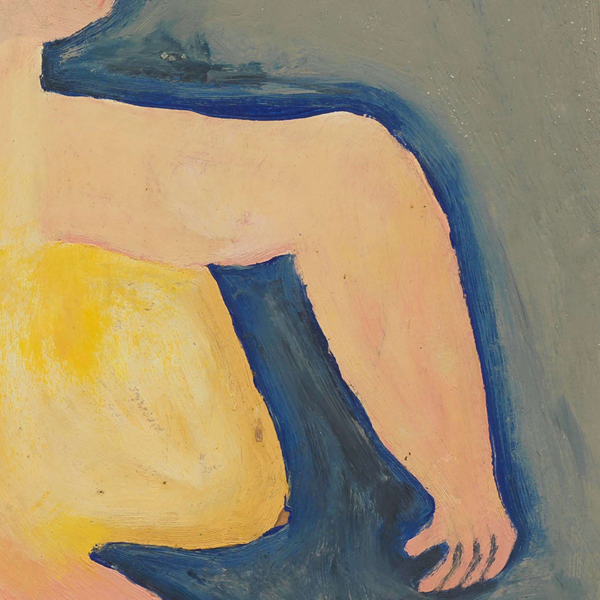 Todo ello se recorta sobre un fondo gris azulado, aplicado con pinceladas amplias y textura visual que aporta profundidad y atmósfera a la composición. El contraste entre el fondo sobrio y la figura cálida otorga a la escena una fuerte presencia estética.