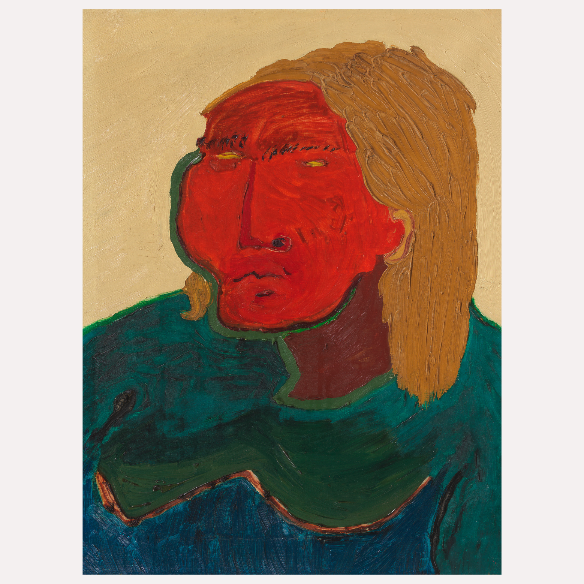 El rostro, centro de la composición, está pintado en un rojo vibrante que domina la superficie y aporta una intensidad dramática inmediata. Los rasgos, delineados con pinceladas marcadas en tonos oscuros, presentan una expresión seria, reflexiva y enigmática, enmarcada por una melena larga en color ocre, aplicada con textura densa y trazos ondulantes.