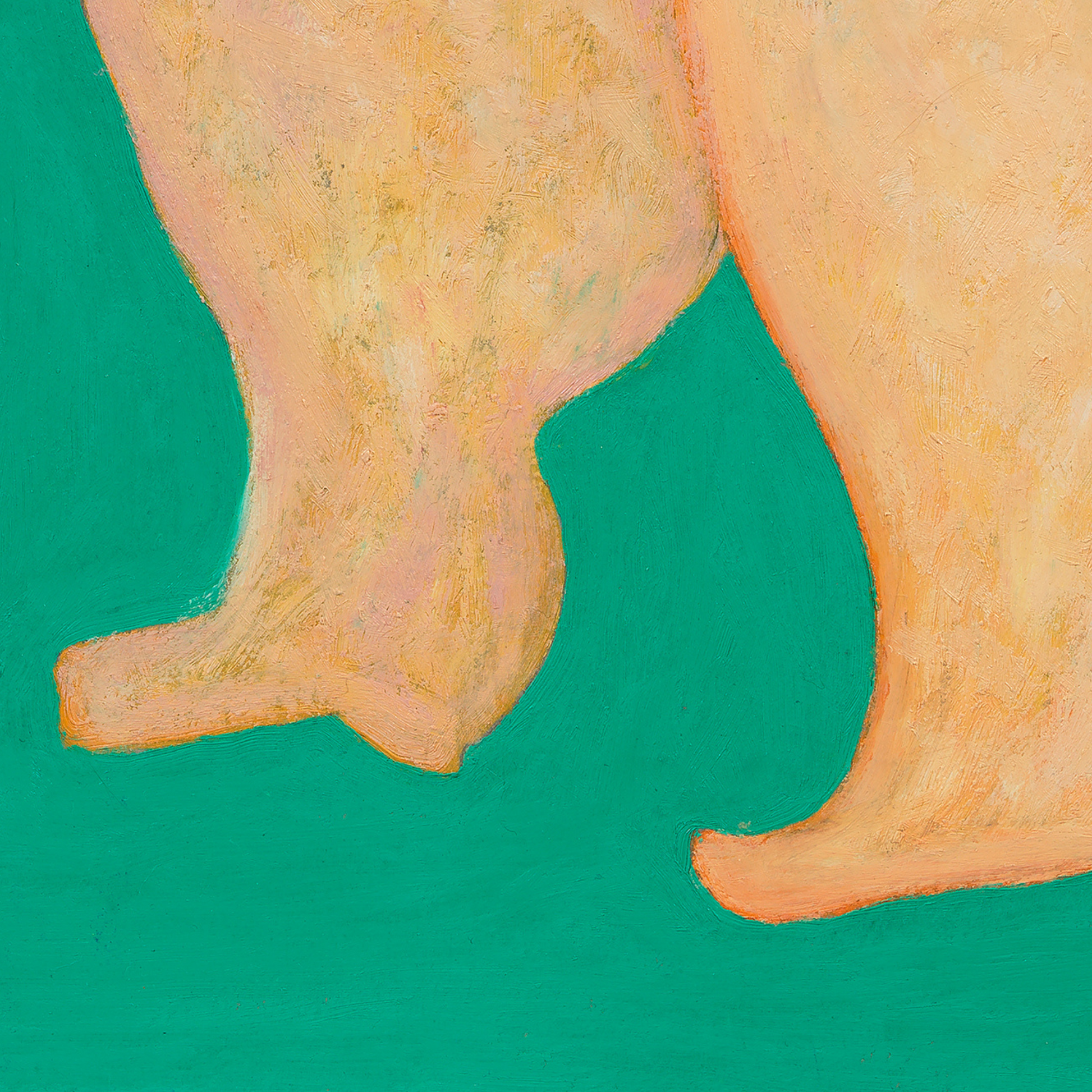 La figura central, estilizada y de proporciones intencionadamente distorsionadas, se presenta de pie sobre un fondo verde intenso que realza la silueta y aporta energía a la composición. El cuerpo, modelado en tonalidades suaves de rosado, melocotón y crema, está delineado por contornos rojizos que acentúan su ritmo visual y sus curvas escultóricas. La postura inclinada hacia atrás, con un brazo en alto y otro apoyado sobre el torso, transmite una sensación de movimiento, fuerza interior y presencia.
