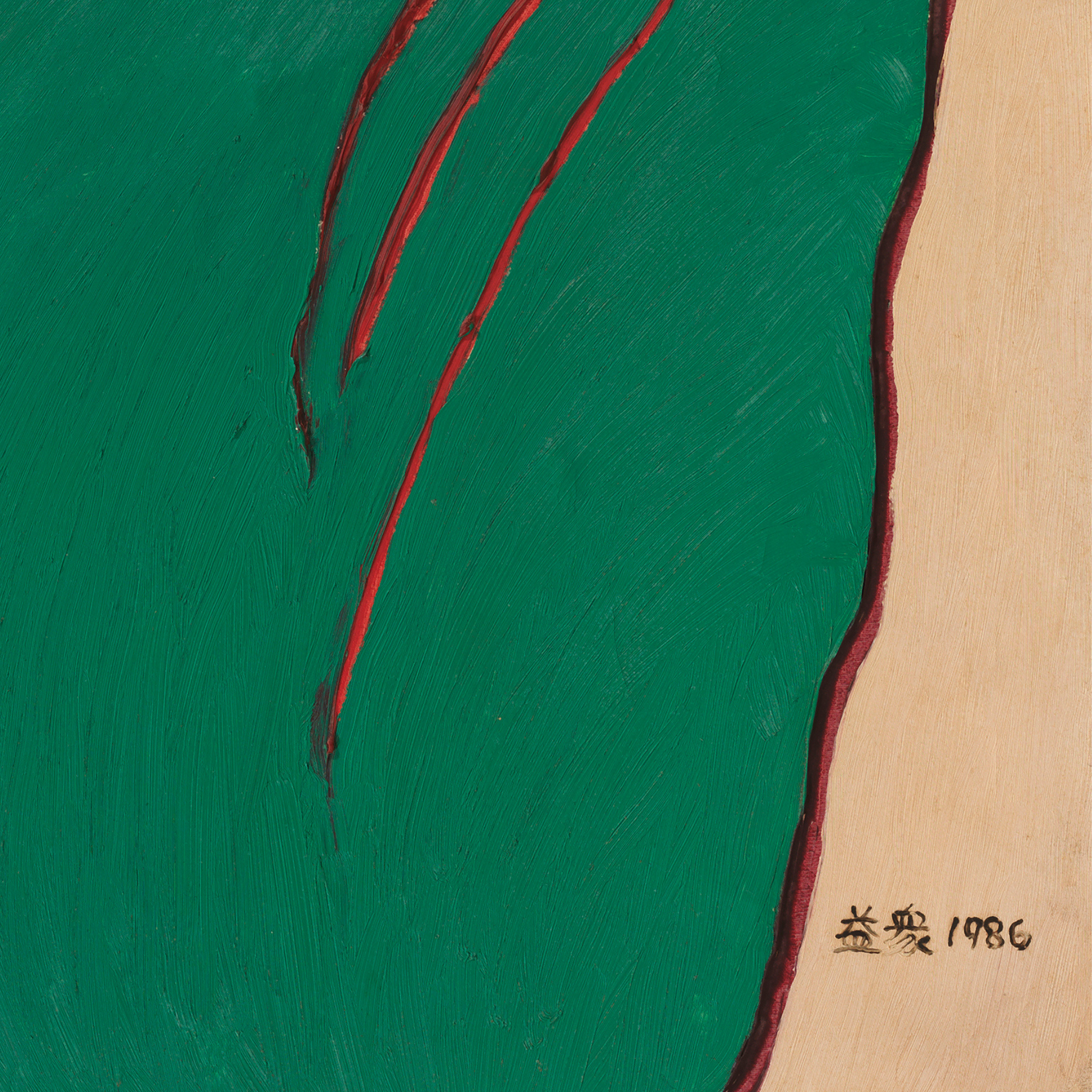 La figura viste una prenda de color verde intenso, que ocupa la mayor parte de la superficie visual, aportando un contraste vibrante frente al fondo beige claro que rodea la escena. Delicados detalles en rojo y azul, visibles en la prenda y el cuello, introducen matices de movimiento y rompen la homogeneidad cromática sin alterar la armonía general de la obra.