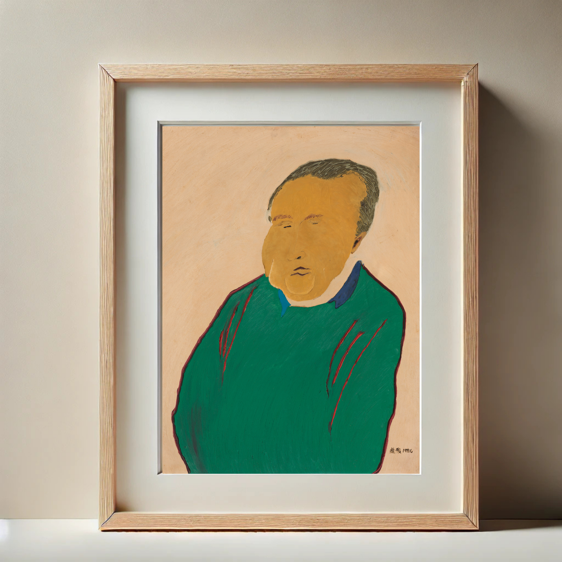 Reproducción artística de una pintura expresionista contemporánea que reinterpreta el retrato humano desde una óptica simplificada y profundamente evocadora. La obra presenta una figura de medio cuerpo ligeramente inclinada hacia un lado, trabajando el lenguaje corporal para transmitir una sensación de introspección, serenidad o cansancio sutil.
