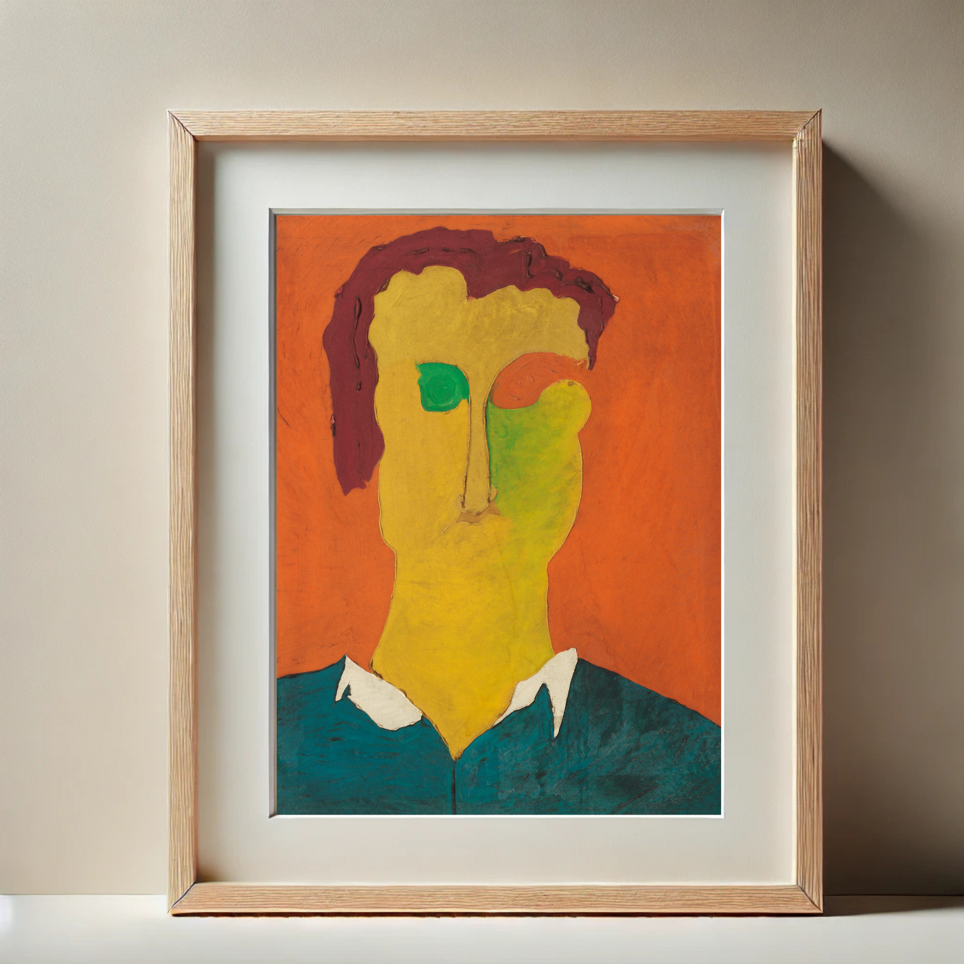 Pintura decorativa impresa en papel. Este colorido cuadro abstracto ofrece una interpretación audaz y subjetiva del retrato humano. La obra de arte representa una figura humana de frente, construida a través de formas distorsionadas, colores vibrantes y una marcada estilización de los rasgos faciales. La pieza evoca emociones ambiguas y destaca por su originalidad plástica.