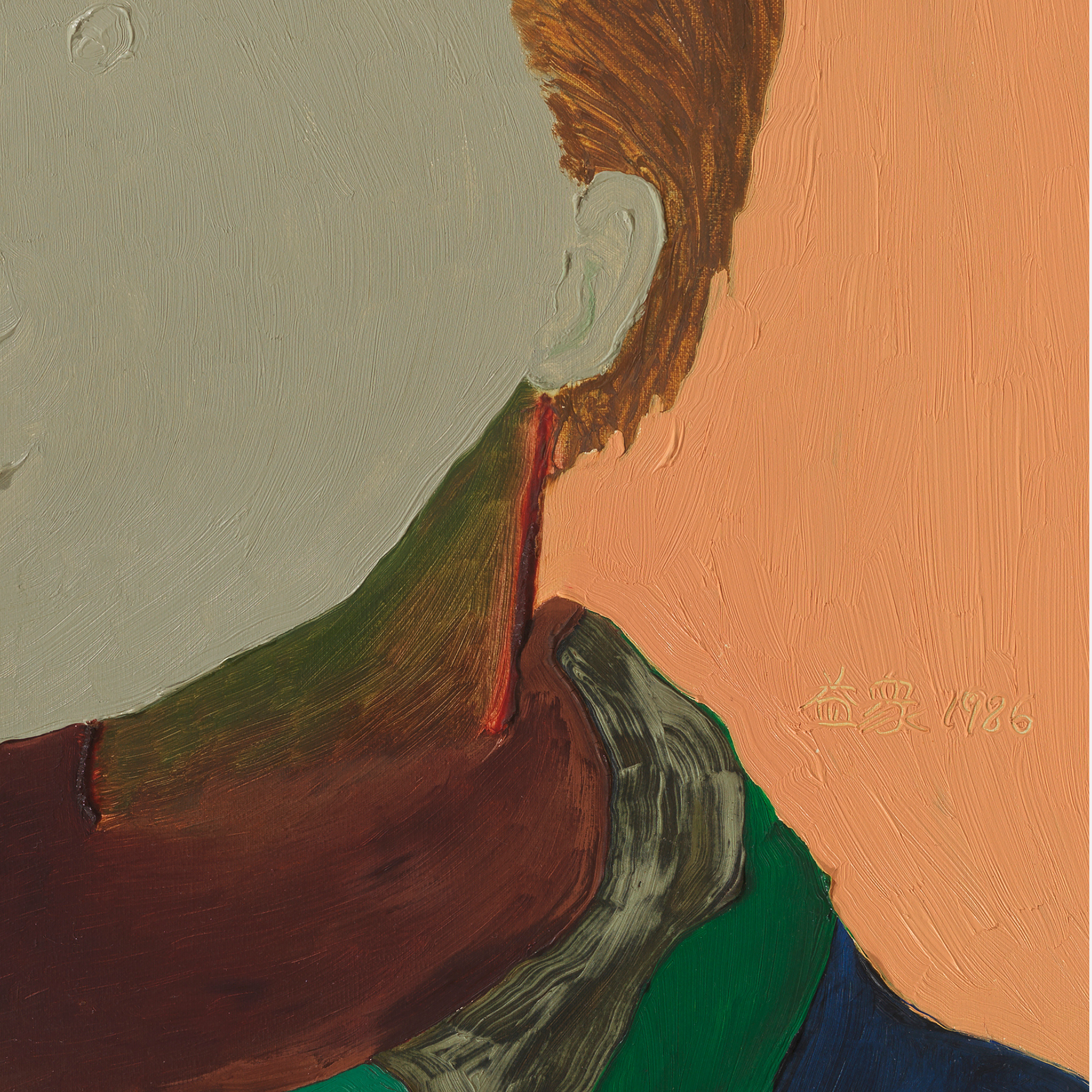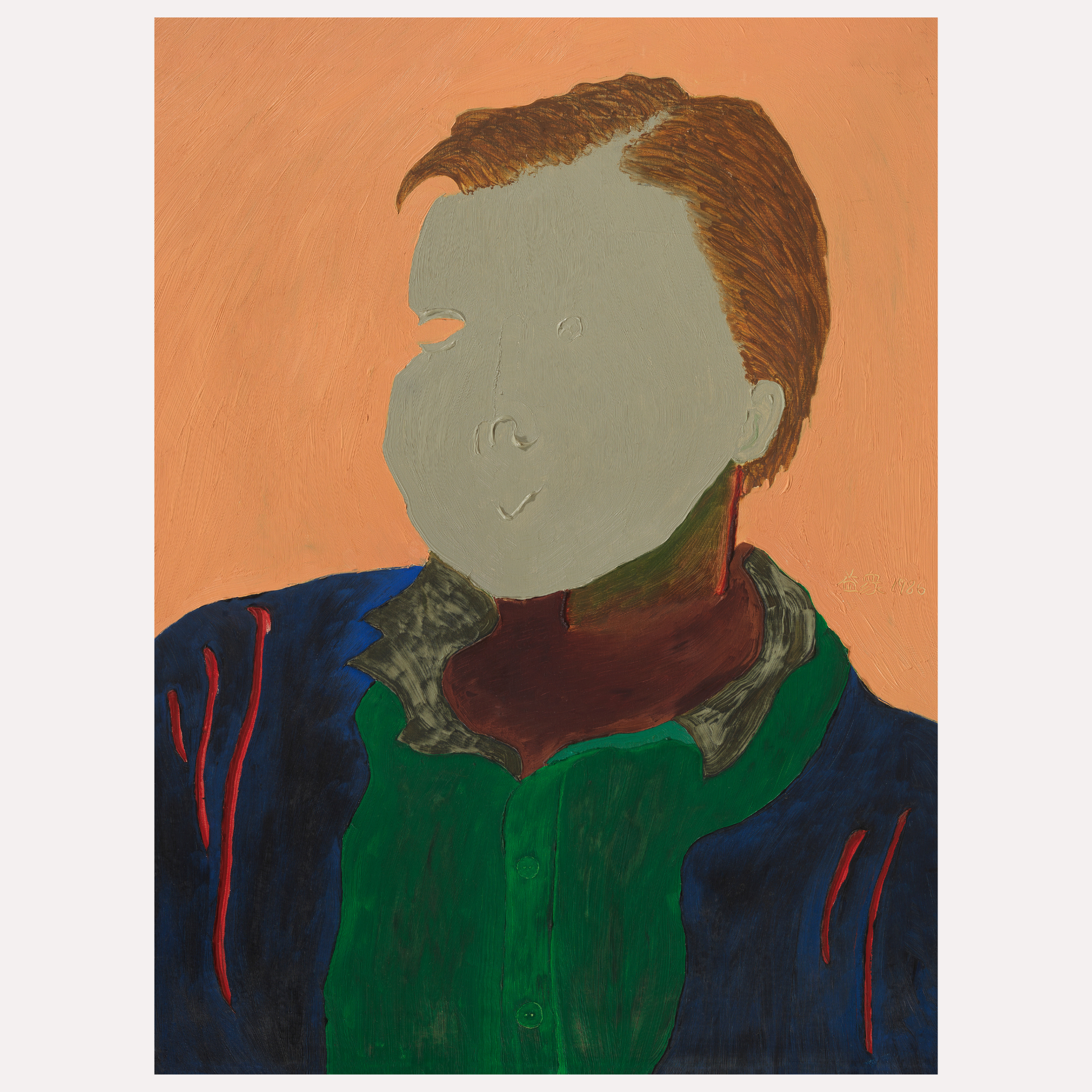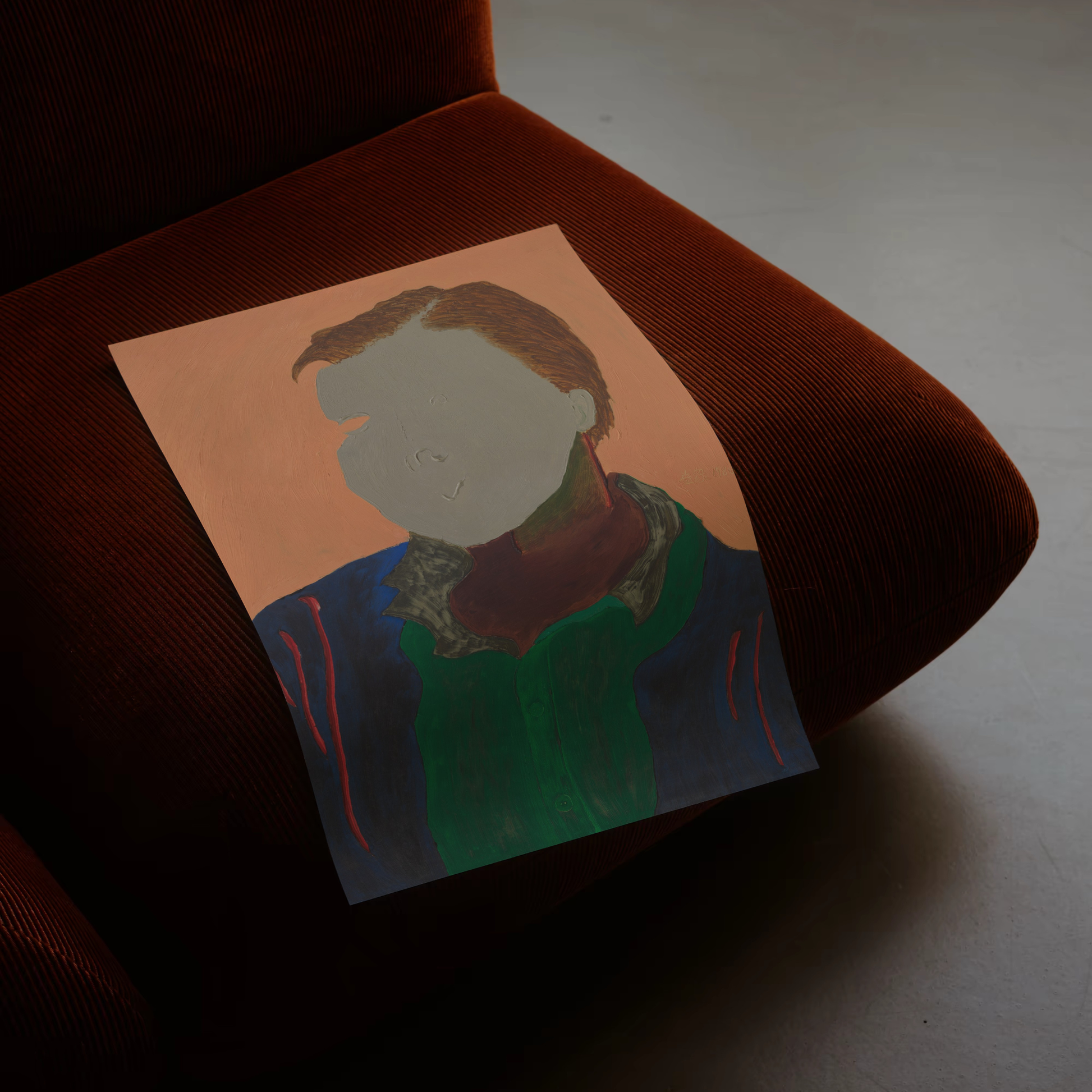 El fondo plano, de un tono durazno cálido y uniforme, actúa como un espacio neutro y sereno que permite que la figura cobre protagonismo absoluto. Esta elección cromática realza la silueta del retratado y refuerza la atmósfera introspectiva y pausada de la obra.